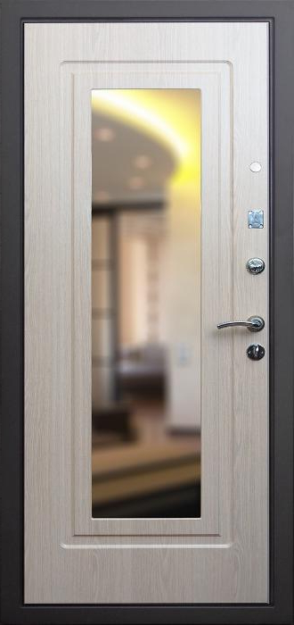 Эта модель создана для тех, кто ценит не только прочность, но и практичность в повседневном использовании. Стальной каркас из профильной трубы и лист металла толщиной 2 мм с рёбрами жёсткости формируют надёжную основу, способную выдерживать серьёзные нагрузки. Снаружи дверь защищена порошковым покрытием, которое устойчиво к влаге, солнцу и механическим повреждениям, а изнутри отделана МДФ-накладкой, придающей интерьеру уют и аккуратность. В центре конструкции внимание привлекает зеркало — удобная деталь, которая избавляет от необходимости в дополнительном настенном аксессуаре и одновременно делает пространство визуально просторнее. Именно здесь название модели — металлическая дверь с зеркалом в дом №2 — обретает своё значение, сочетая функциональность с эстетикой. Для повышения безопасности предусмотрены два замка российского производства с независимыми системами запирания, а также блокираторы. Два контура уплотнителя защищают от сквозняков и пыли, а возможность выбрать направление открывания делает установку универсальной. Металлическая дверь с зеркалом в дом №2 от производителя: быстрое изготовление и монтаж в Жуковском, индивидуальные размеры, широкий выбор материалов и фурнитуры, официальная гарантия до 10 лет.