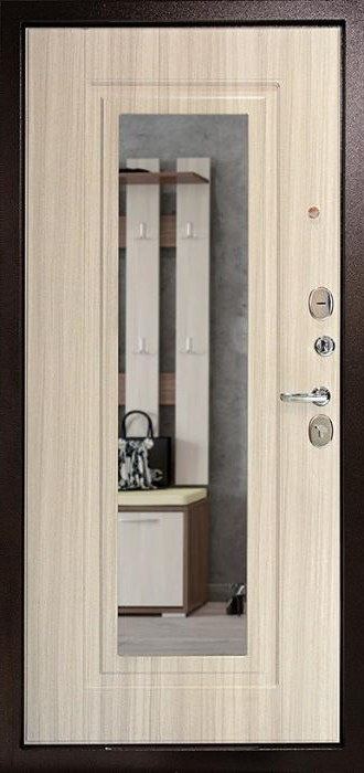 Прочный стальной каркас, лист металла толщиной 2 мм и система блокираторов делают эту модель надежным барьером для квартиры, офиса или частного дома. Внешняя поверхность покрыта молотковым напылением, устойчивым к механическим повреждениям и перепадам температуры, благодаря чему дверь сохраняет аккуратный вид долгие годы. Внутренняя накладка МДФ добавляет уюта и гармонично сочетается с интерьером прихожей. Зеркало на полотне выполняет не только декоративную функцию, но и делает пространство визуально шире. Зеленая входная дверь в квартиру №2 комплектуется двумя замками российских производителей — сувальдным Просам и цилиндровым Мосрентген, каждый из которых оснащён тремя ригелями. Два контура резинового уплотнения помогают минимизировать сквозняки и шум, а возможность выбрать сторону и тип открывания делает установку максимально удобной. При необходимости отделку, замки и дополнительные элементы можно адаптировать под индивидуальные требования. Зеленая входная дверь в квартиру №2 от производителя: быстрое изготовление и монтаж в Жуковском, индивидуальные размеры, широкий выбор материалов и фурнитуры, официальная гарантия до 10 лет.