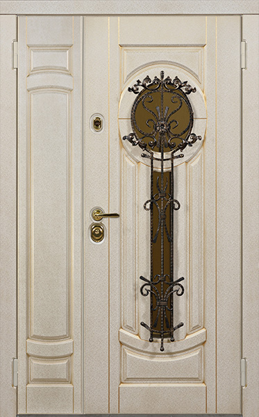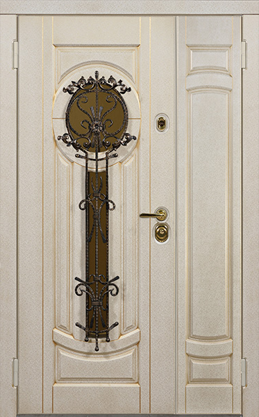 Двухстворчатая парадная дверь с ковкой и стеклом белая №30 — это сочетание красоты и надёжности. Конструкция из профильной трубы 50х25 мм и металлического листа толщиной 2 мм обеспечивает долговечность и стойкость к внешним воздействиям. Элементы ковки придают двери изысканный вид, а стеклопакет позволяет создать атмосферу лёгкости и прозрачности. Внешняя и внутренняя отделка выполнены из плиты МДФ, что делает дверь не только привлекательной, но и устойчивой к механическим повреждениям. Для дополнительной герметичности используются уплотнители с двумя контурами, а блокираторы обеспечат безопасность. Вариативность размеров и возможность добавления дополнительных опций, таких как шумо- и теплоизоляция, делают эту модель универсальной для установки в любом интерьере. Двухстворчатая парадная дверь с ковкой и стеклом белая №30 от производителя: быстрое изготовление и монтаж в Жуковском, индивидуальные размеры, широкий выбор материалов и фурнитуры, официальная гарантия до 10 лет.