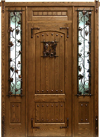 Входная металлическая дверь с порошковым покрытием стеклом и ковкой в частный дом №27